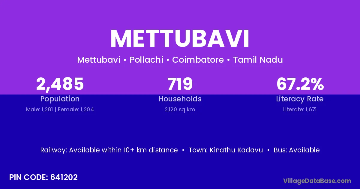 Mettubavi village has a total population of 2,485 people, of which 1,281 are males and 1,204 are females.