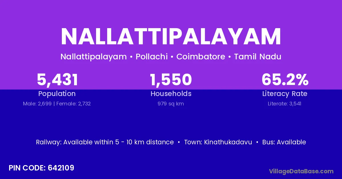 Nallattipalayam village has a total population of 5,431 people, of which 2,699 are males and 2,732 are females.
