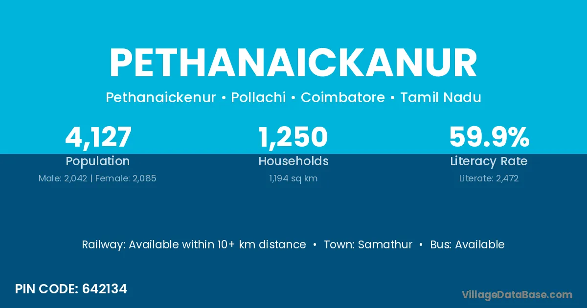 Pethanaickanur village has a total population of 4,127 people, of which 2,042 are males and 2,085 are females.