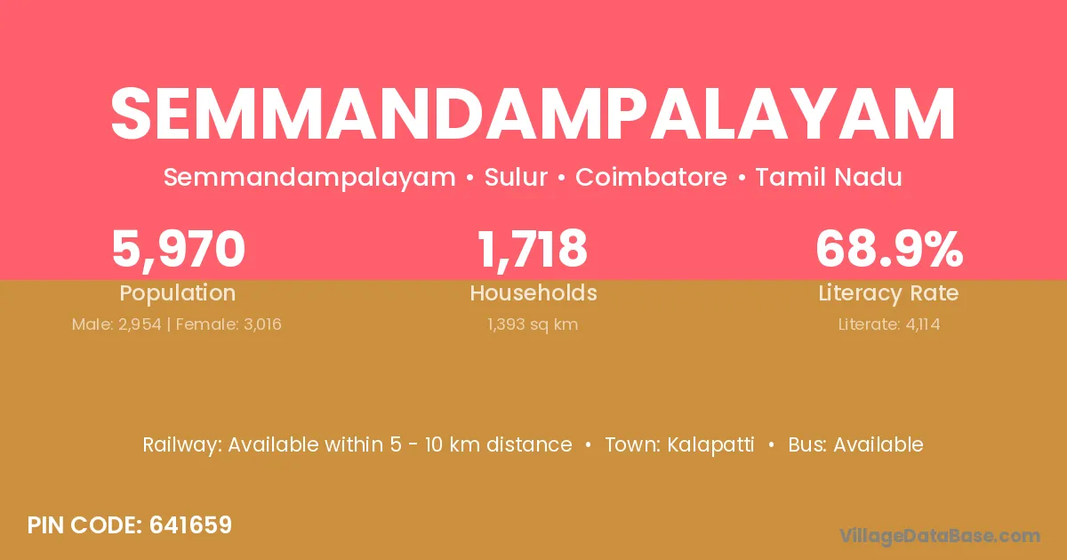 Semmandampalayam village has a total population of 5,970 people, of which 2,954 are males and 3,016 are females.