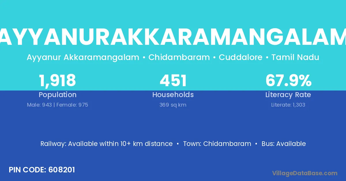 Ayyanurakkaramangalam village has a total population of 1,918 people, of which 943 are males and 975 are females.