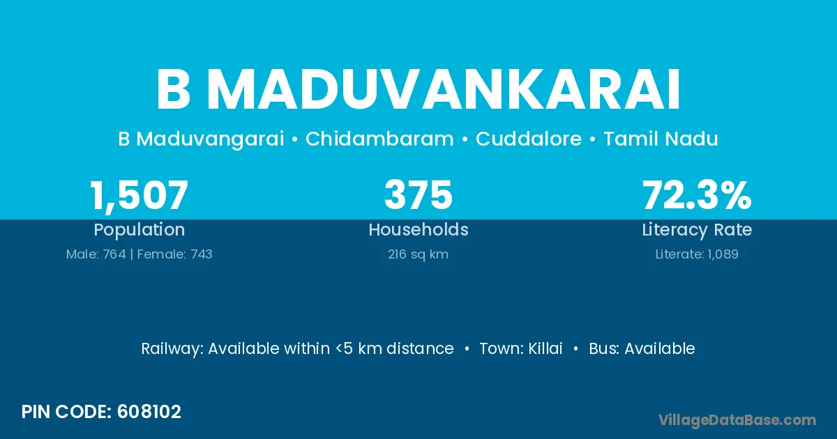 B Maduvankarai village has a total population of 1,507 people, of which 764 are males and 743 are females.