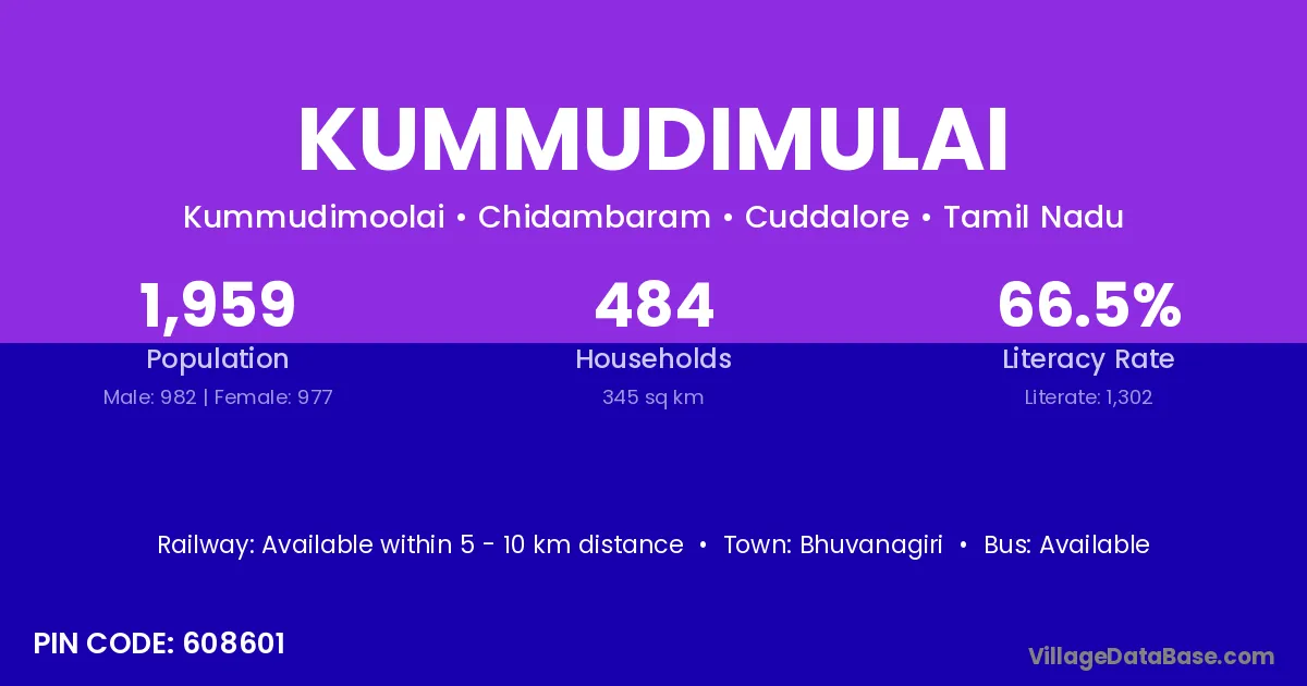 Kummudimulai village has a total population of 1,959 people, of which 982 are males and 977 are females.