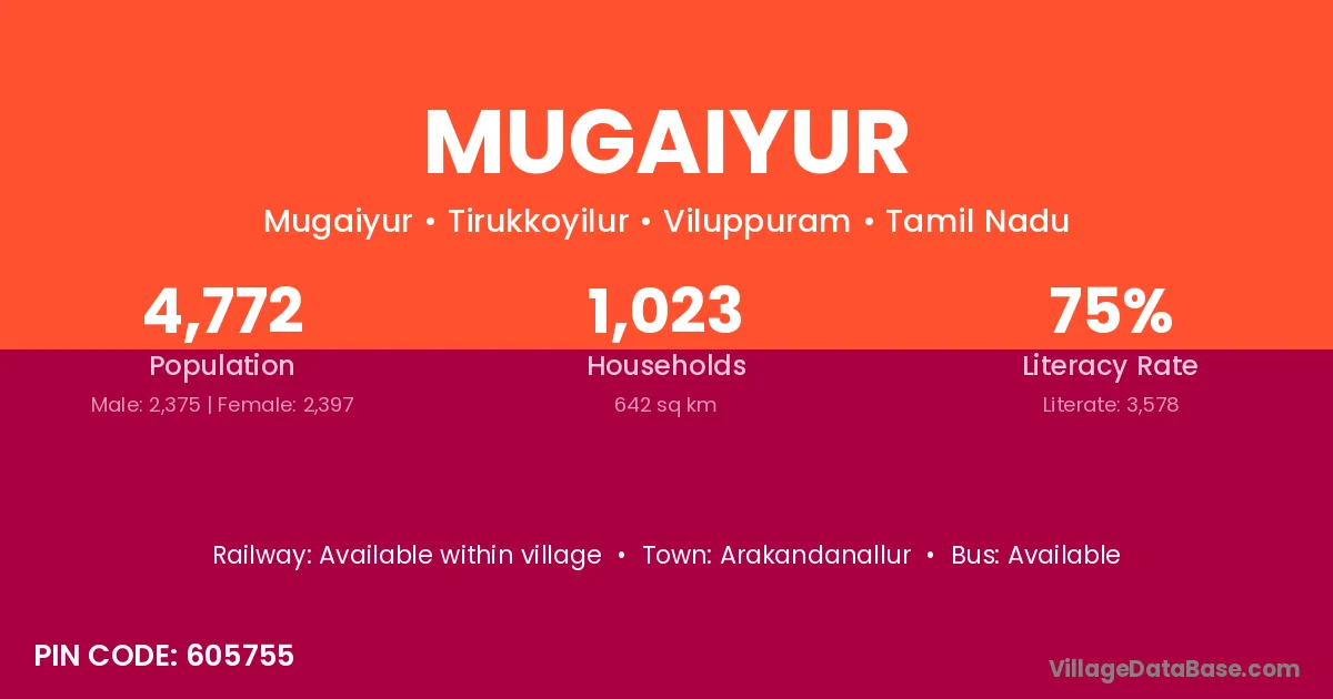 Mugaiyur village has a total population of 1,261 people, of which 626 are males and 635 are females.
