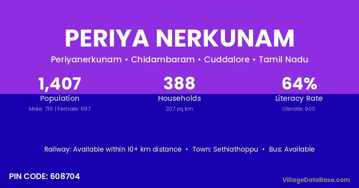 Periya Nerkunam village has a total population of 1,407 people, of which 710 are males and 697 are females.