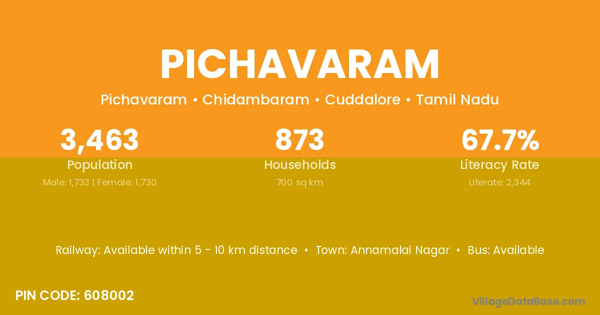 Pichavaram village has a total population of 3,463 people, of which 1,733 are males and 1,730 are females.