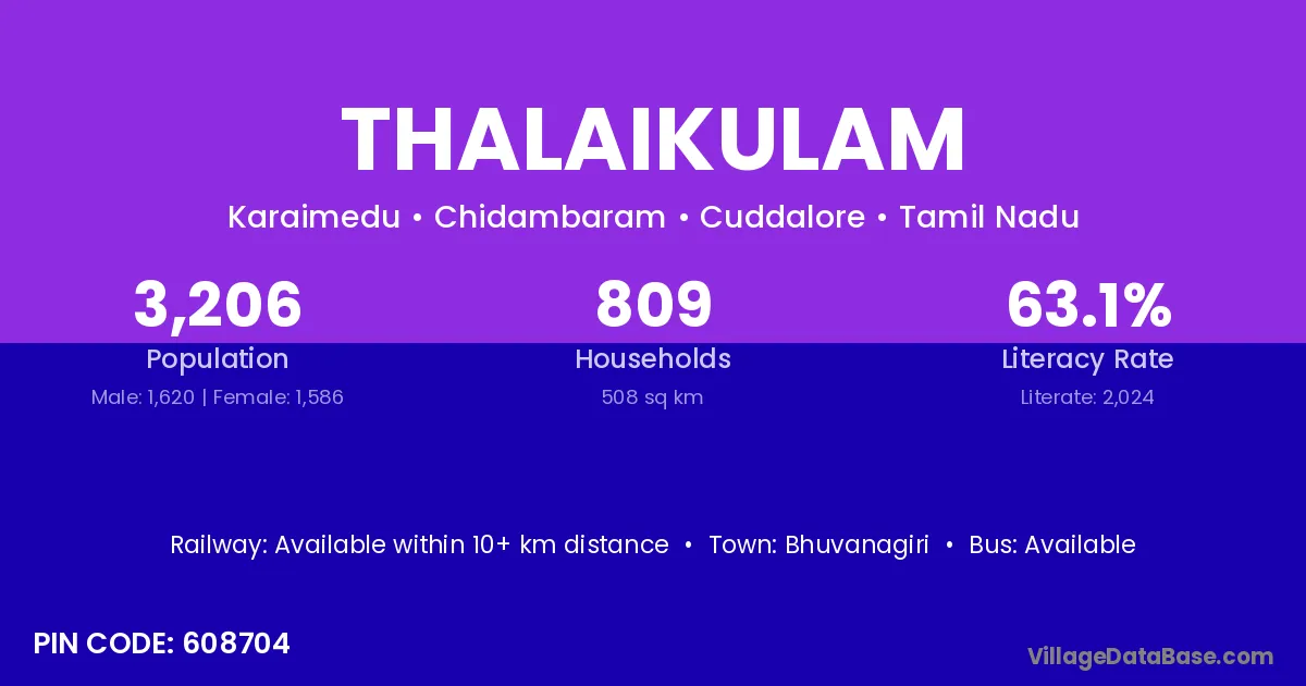 Thalaikulam village has a total population of 3,206 people, of which 1,620 are males and 1,586 are females.