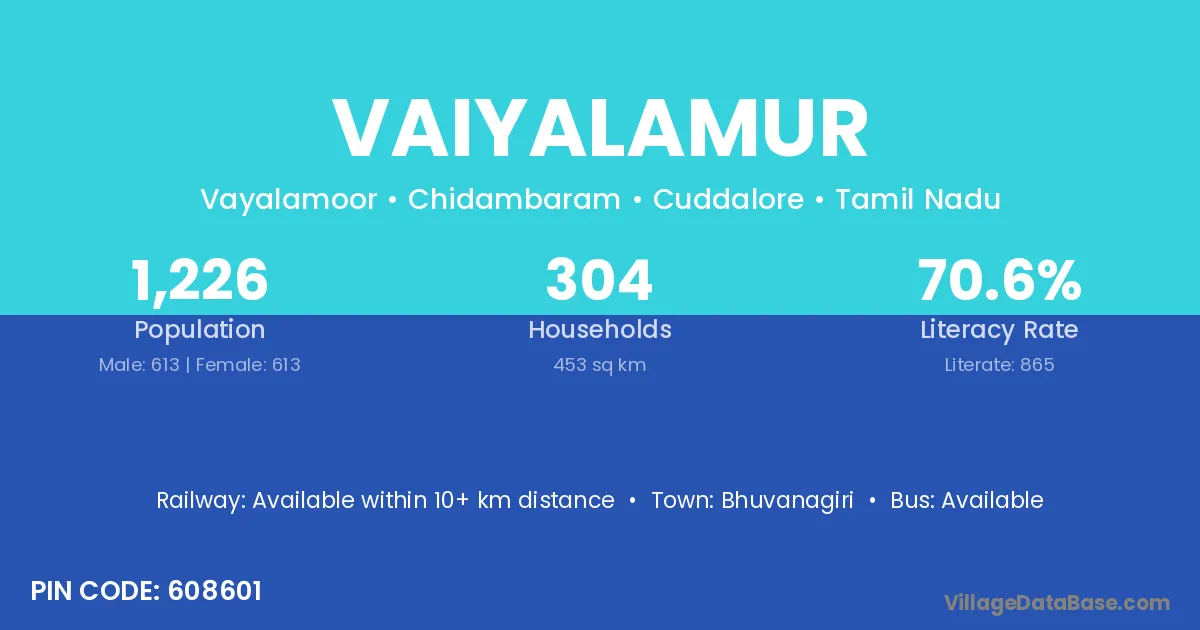 Vaiyalamur village has a total population of 1,226 people, of which 613 are males and 613 are females.