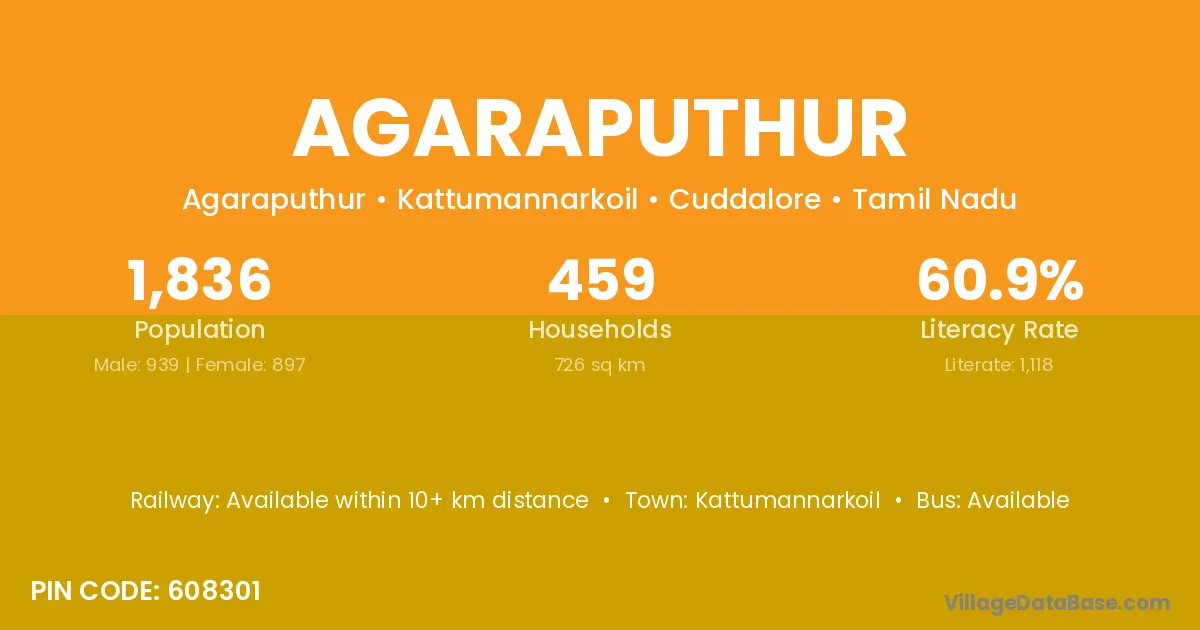 Agaraputhur village has a total population of 1,836 people, of which 939 are males and 897 are females.