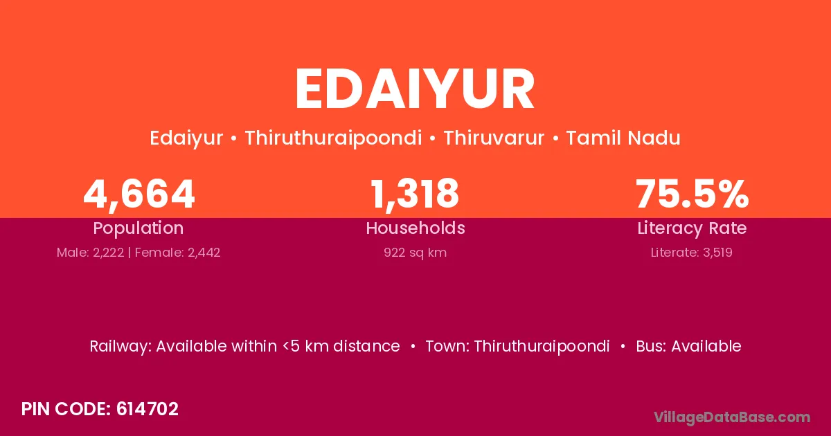 Edaiyur village has a total population of 1,227 people, of which 615 are males and 612 are females.