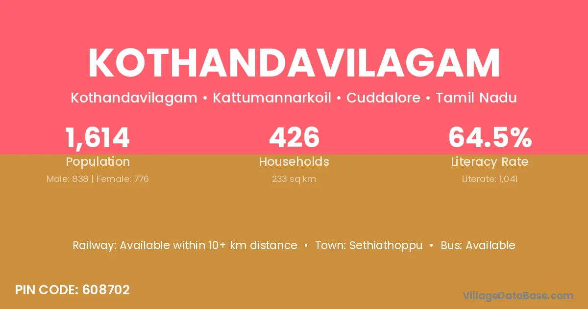 Kothandavilagam village has a total population of 1,614 people, of which 838 are males and 776 are females.