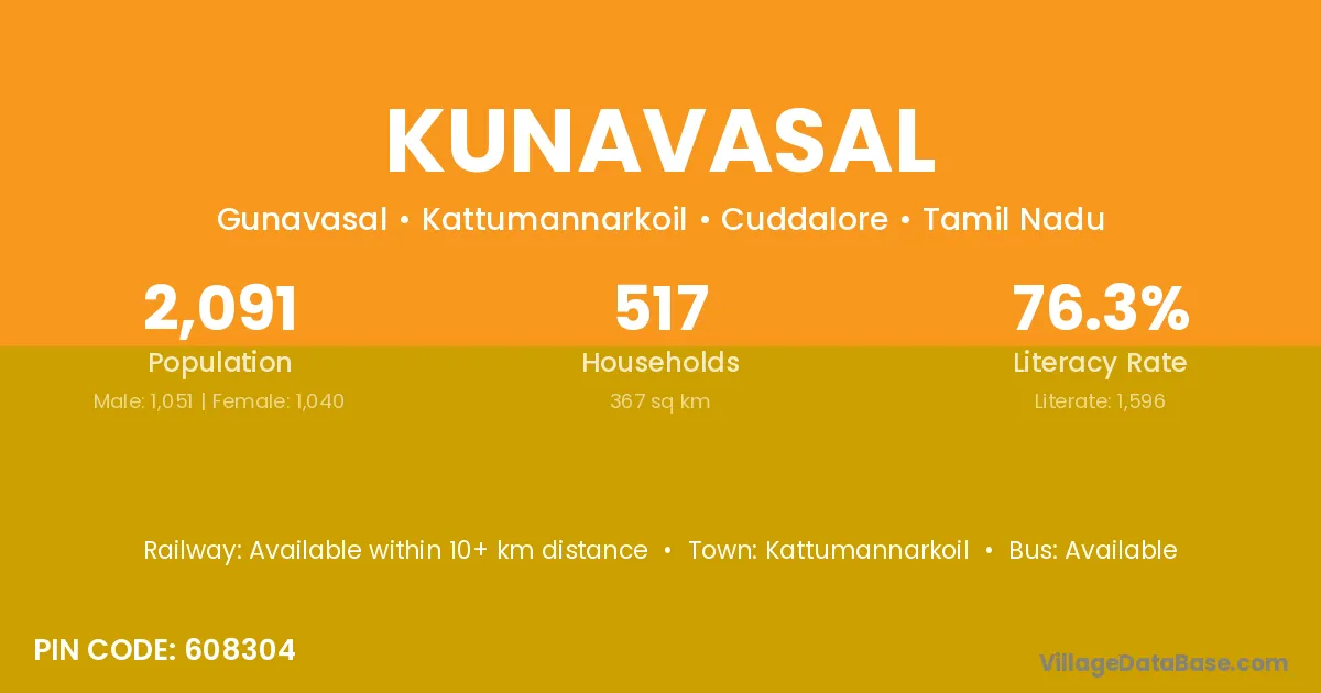 According to Census 2011 information, the village code of Kunavasal village is 608304.