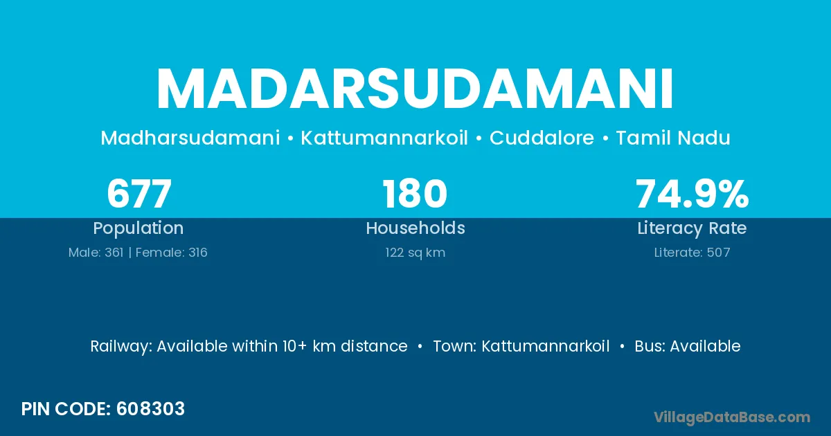 According to Census 2011 information, the village code of Madarsudamani village is 608303.