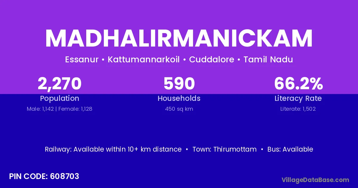 Madhalirmanickam village has a total population of 2,270 people, of which 1,142 are males and 1,128 are females.