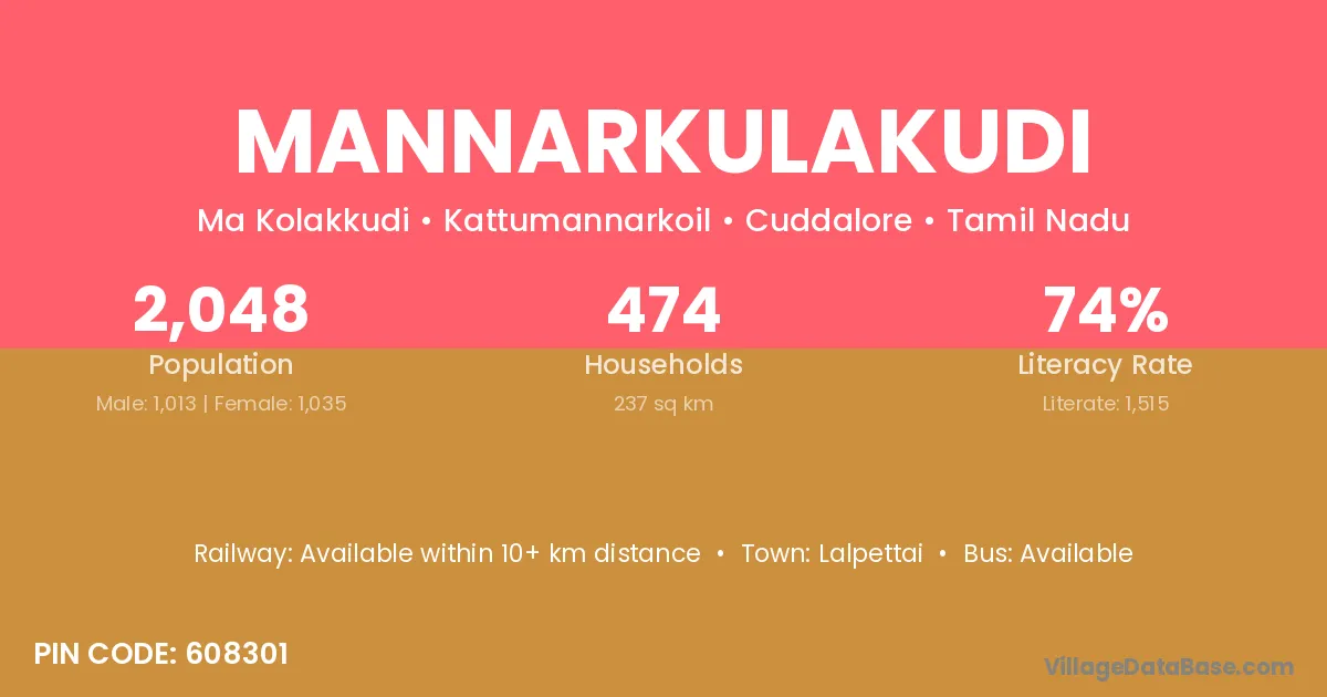 Mannarkulakudi village has a total population of 2,048 people, of which 1,013 are males and 1,035 are females.