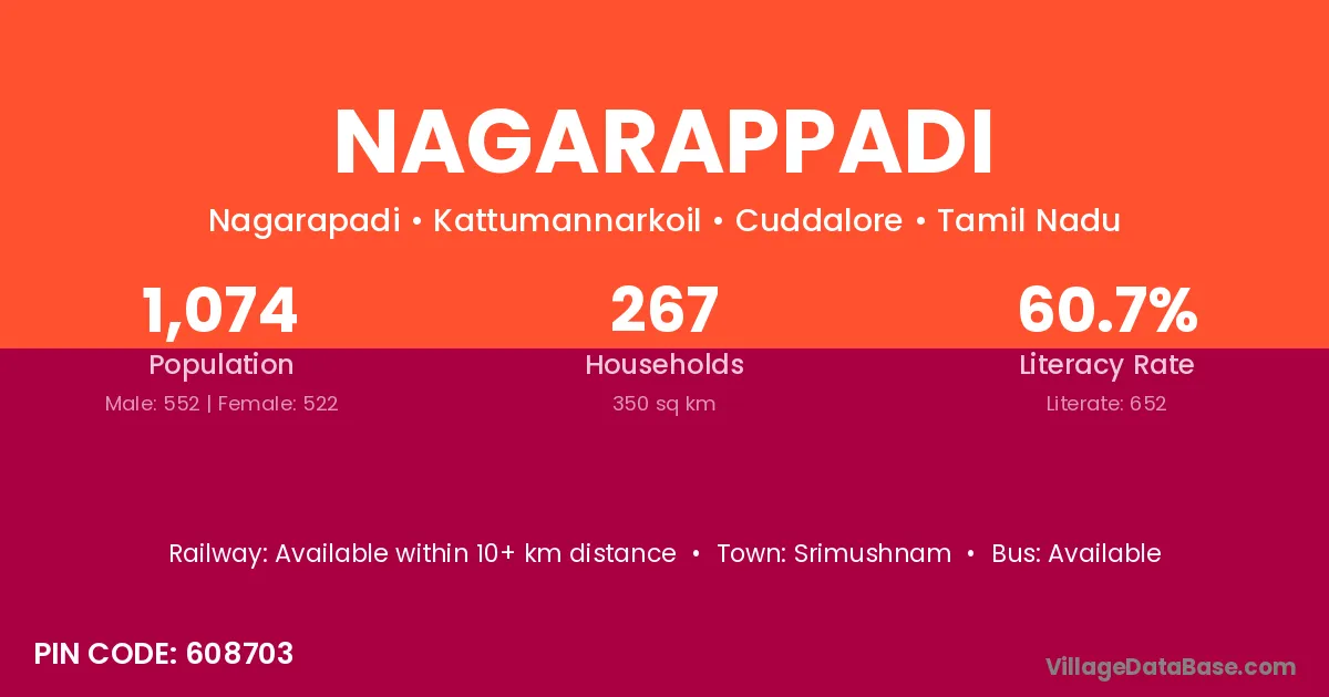 Nagarappadi village has a total population of 1,074 people, of which 552 are males and 522 are females.