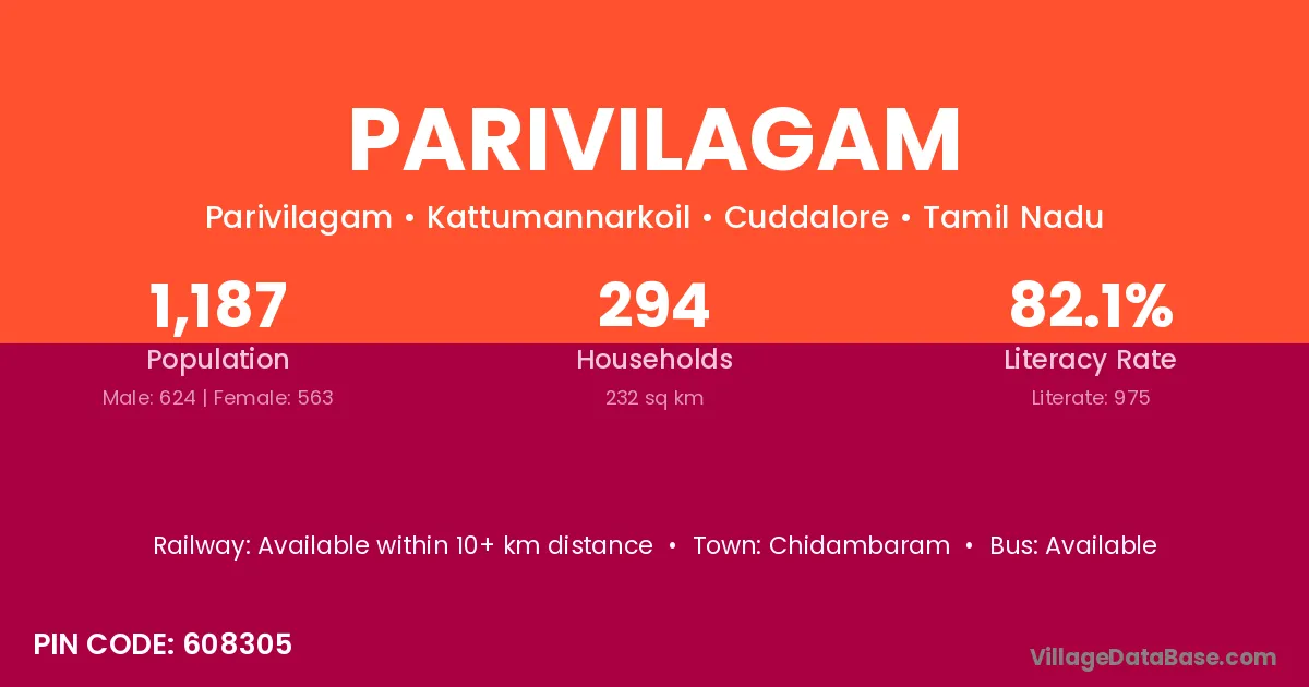 Parivilagam village has a total population of 1,187 people, of which 624 are males and 563 are females.
