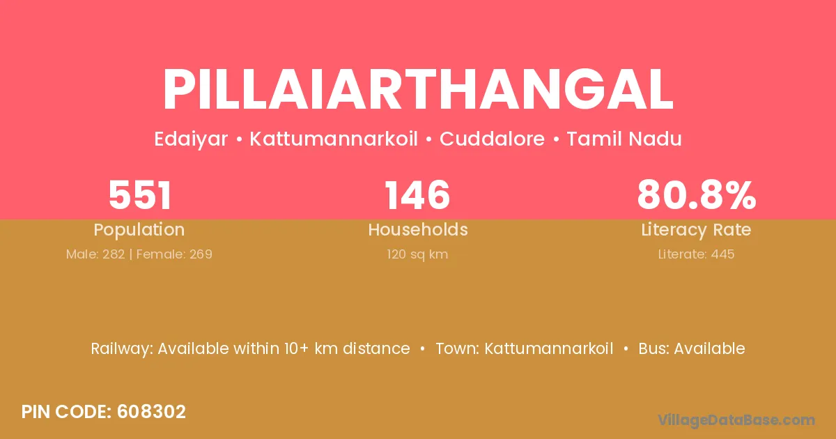 Pillaiarthangal village has a total population of 551 people, of which 282 are males and 269 are females.