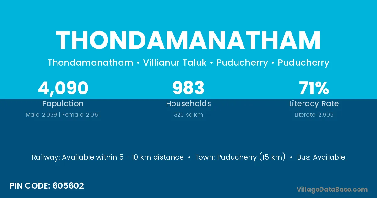 The literacy rate of Thondamanatham village is 78.83%. Male literacy stands at 84.05% and female literacy at 72.73%.