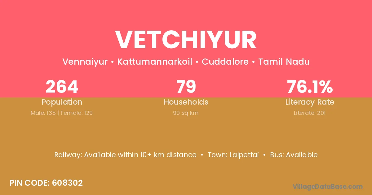 Vetchiyur village has a total population of 264 people, of which 135 are males and 129 are females.