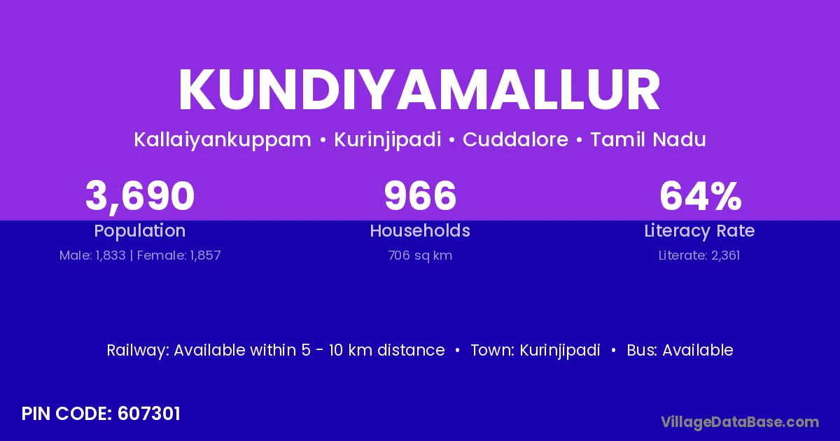 Kundiyamallur village has a total population of 3,690 people, of which 1,833 are males and 1,857 are females.