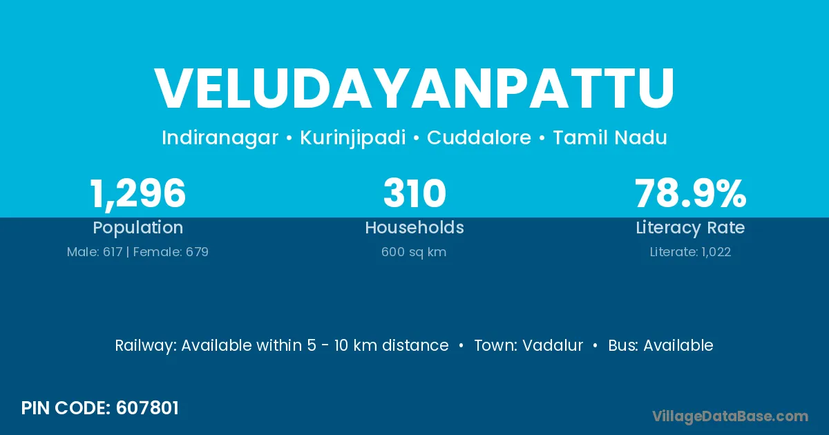 Veludayanpattu village has a total population of 1,296 people, of which 617 are males and 679 are females.