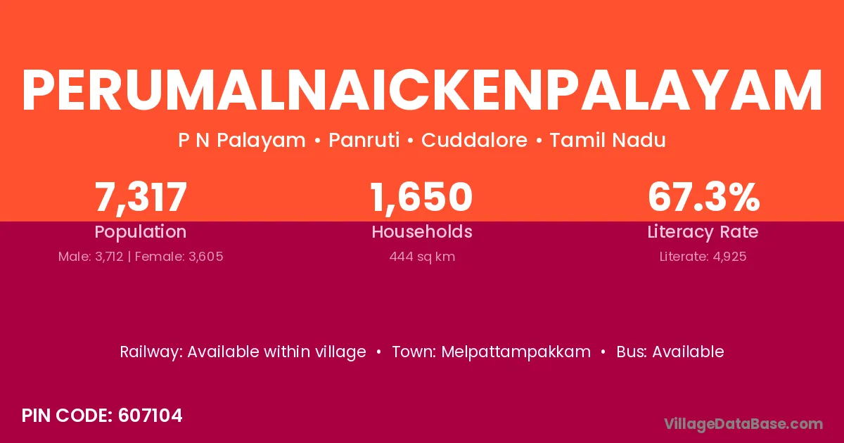 Perumalnaickenpalayam village has a total population of 7,317 people, of which 3,712 are males and 3,605 are females.