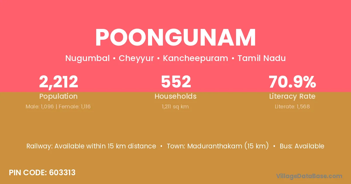 Poongunam village has a total population of 3,114 people, of which 1,546 are males and 1,568 are females.
