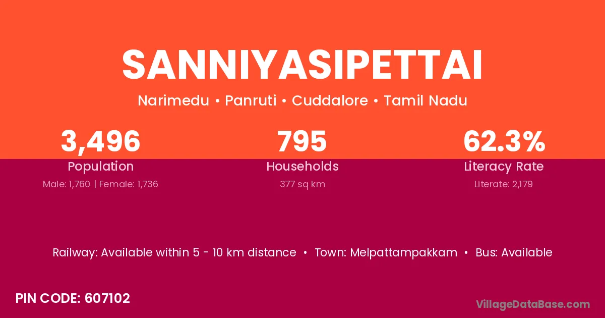Sanniyasipettai village has a total population of 3,496 people, of which 1,760 are males and 1,736 are females.