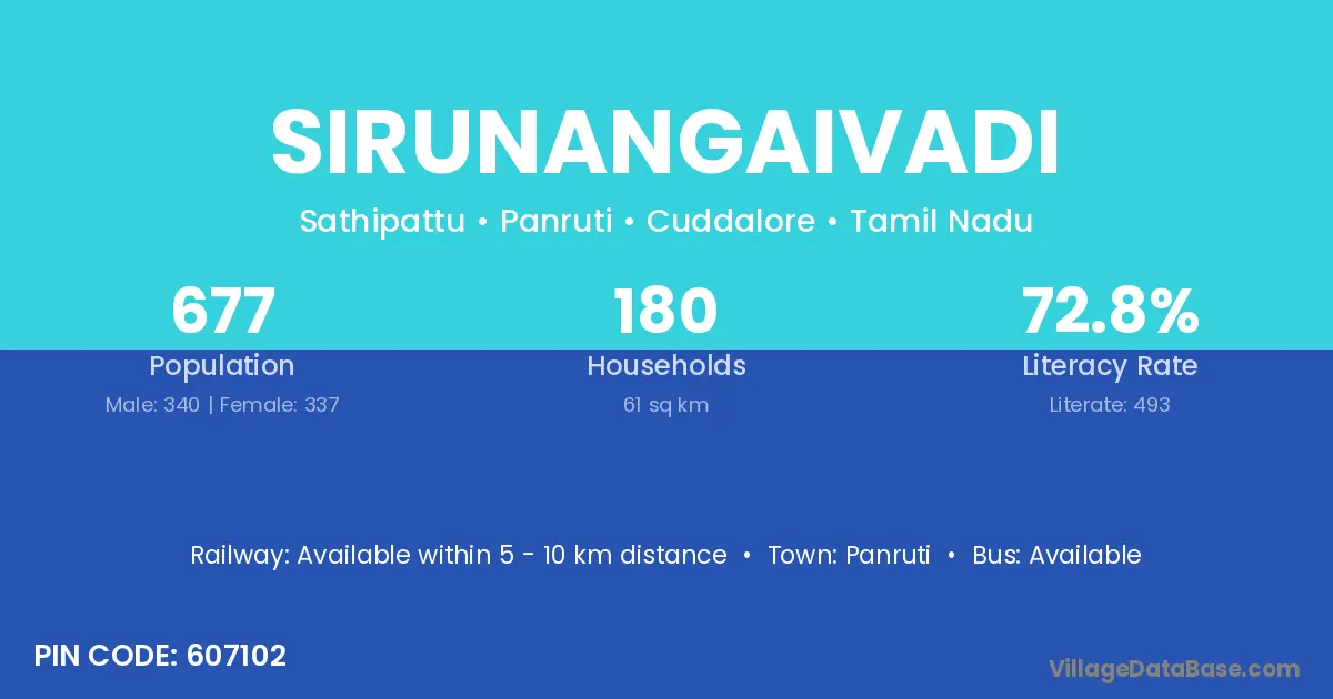Sirunangaivadi village has a total population of 677 people, of which 340 are males and 337 are females.