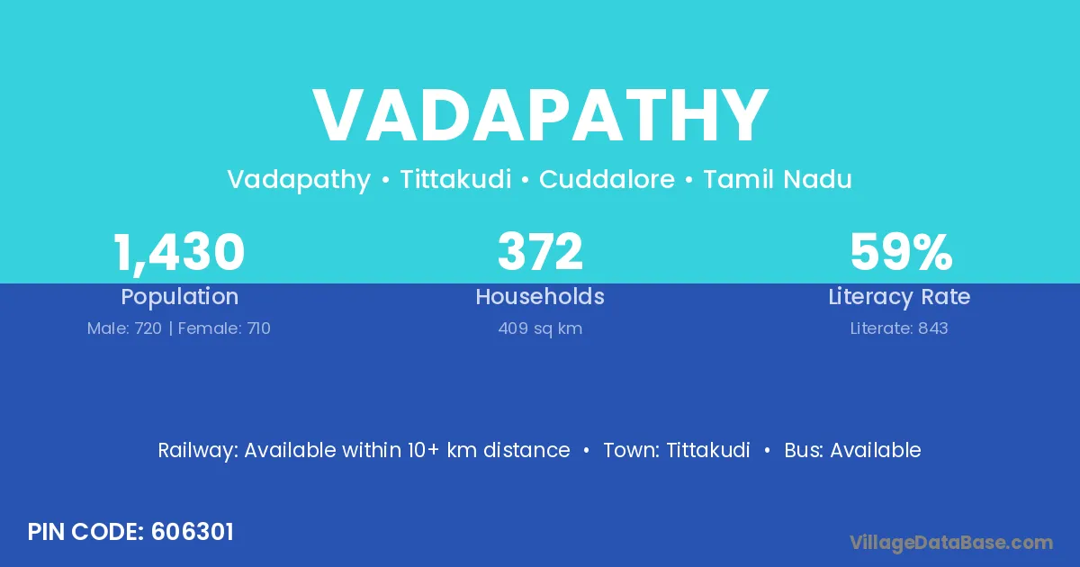 Tittakudi is the nearest town to Vadapathy village for major economic activities