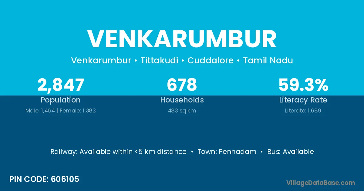 Venkarumbur village has a total population of 2,847 people, of which 1,464 are males and 1,383 are females.
