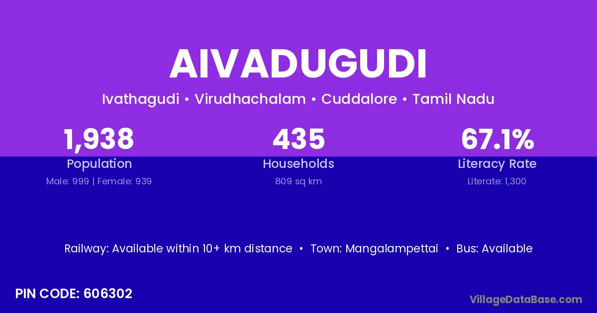 Aivadugudi village has a total population of 1,938 people, of which 999 are males and 939 are females.