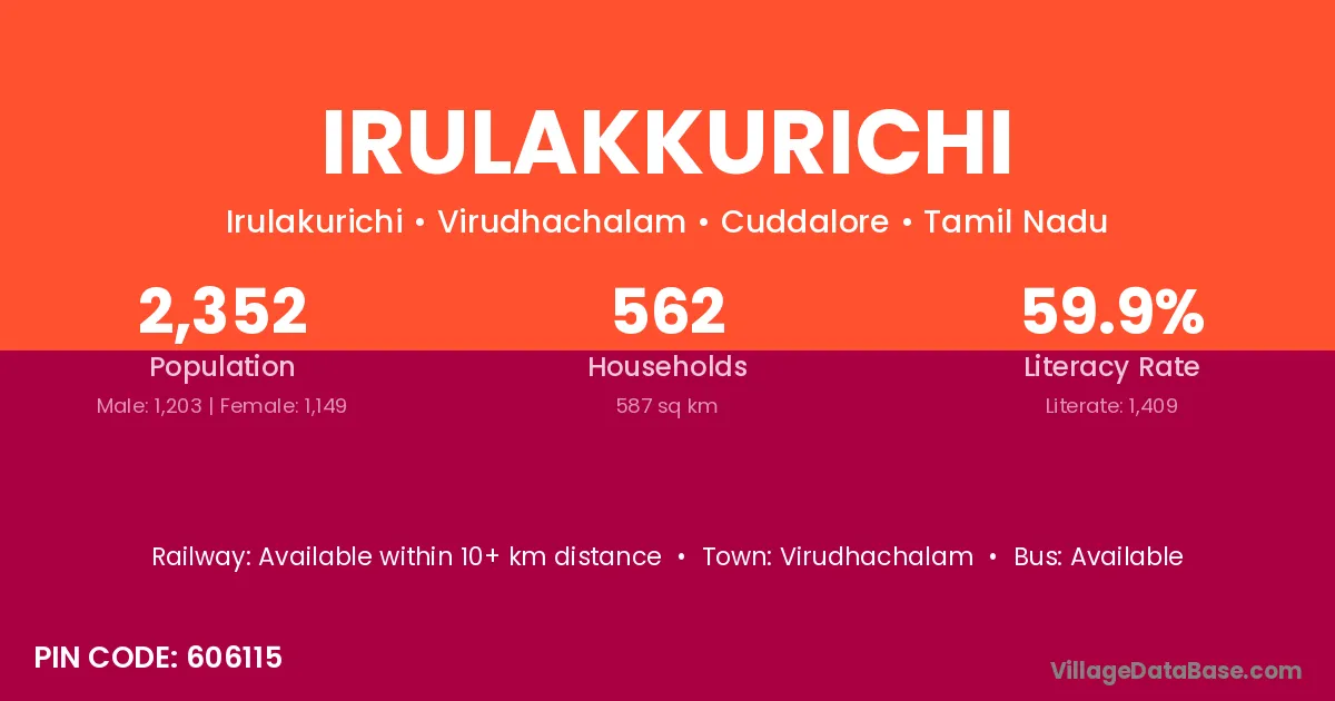 Virudhachalam is the nearest town to Irulakkurichi village for major economic activities