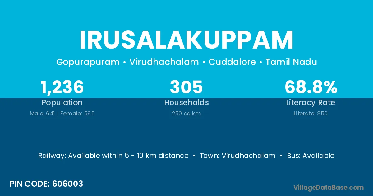 Irusalakuppam village has a total population of 1,236 people, of which 641 are males and 595 are females.