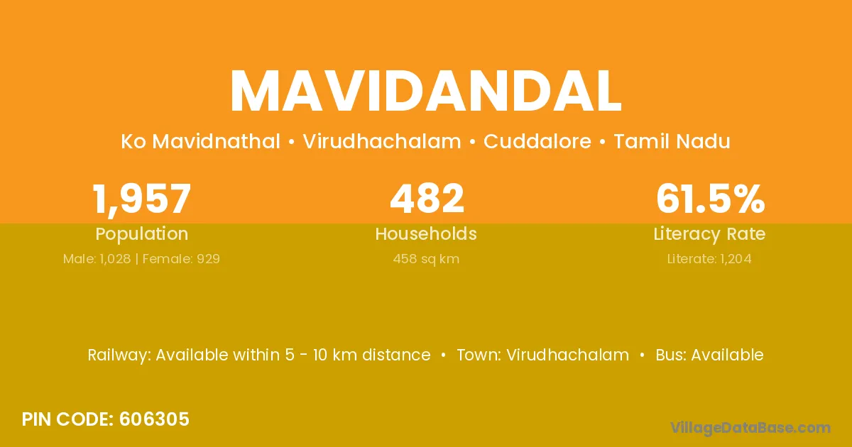 Virudhachalam is the nearest town to Mavidandal village for major economic activities