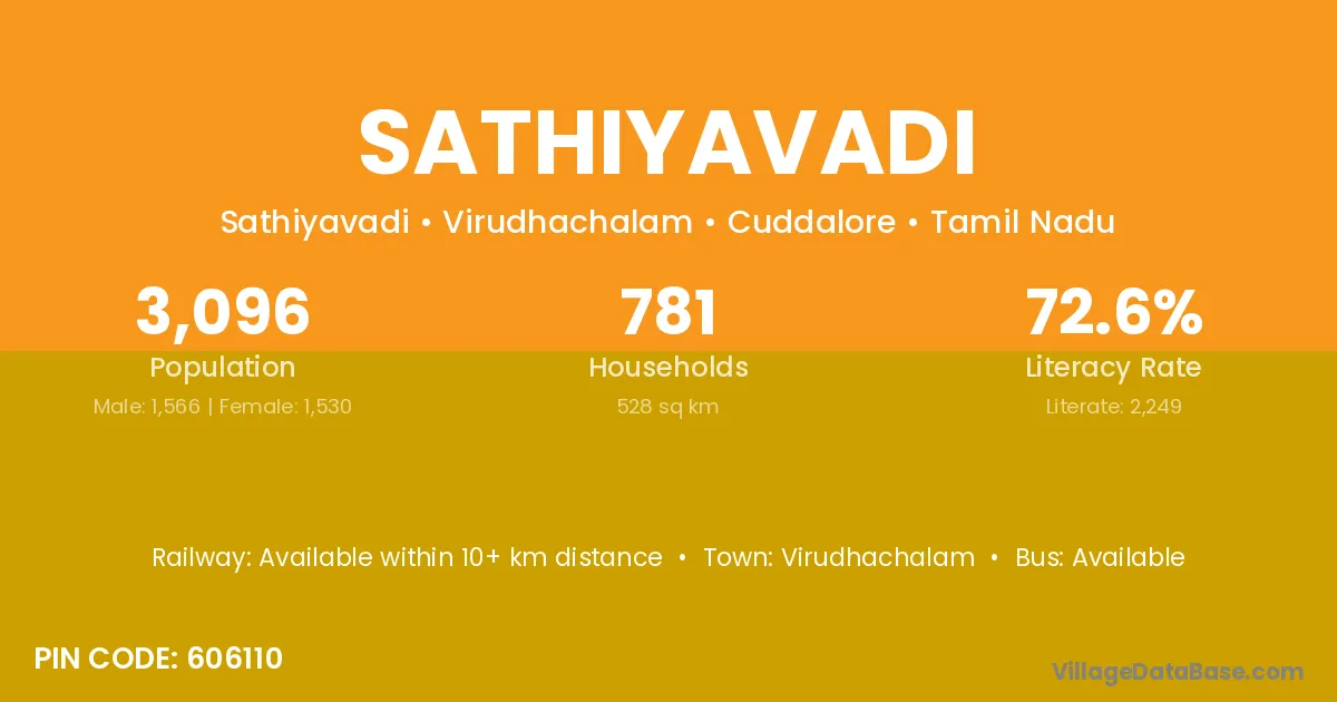 Sathiyavadi village has a total population of 3,096 people, of which 1,566 are males and 1,530 are females.