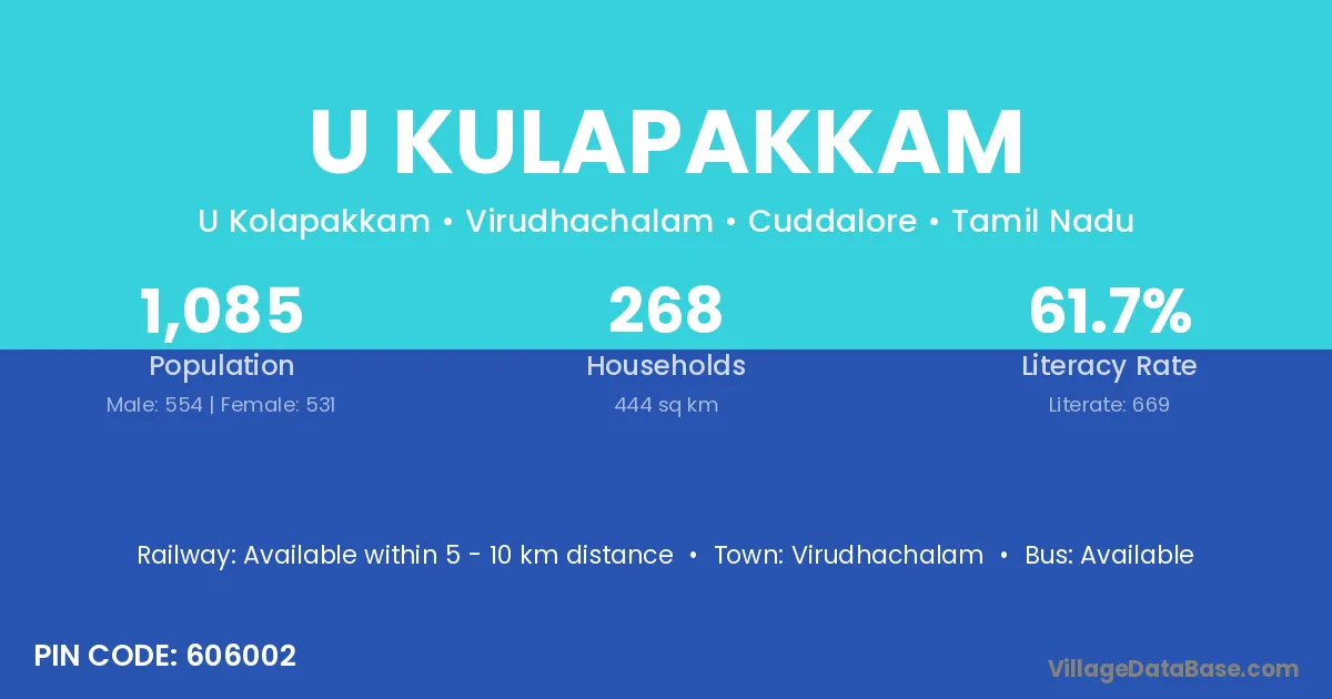 U Kulapakkam village has a total population of 1,085 people, of which 554 are males and 531 are females.