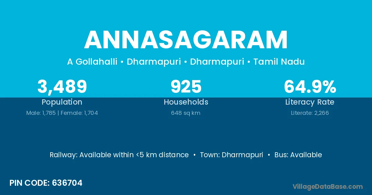 Annasagaram village has a total population of 3,489 people, of which 1,785 are males and 1,704 are females.