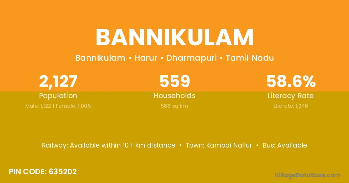 Bannikulam village has a total population of 2,127 people, of which 1,122 are males and 1,005 are females.