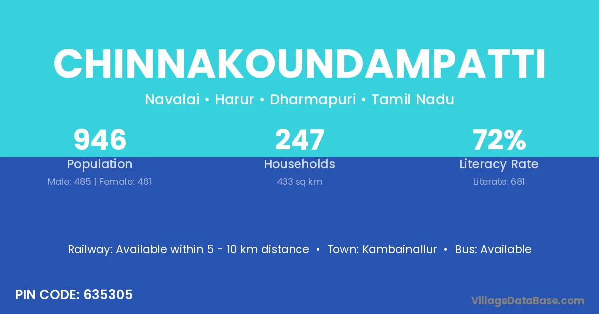 Chinnakoundampatti village has a total population of 946 people, of which 485 are males and 461 are females.