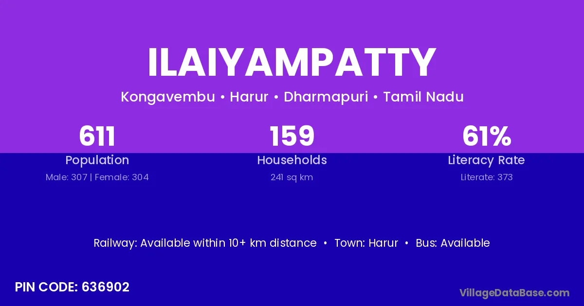 Harur is the nearest town to Ilaiyampatty village for major economic activities