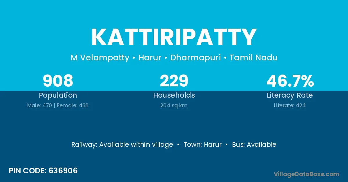 Kattiripatty village has a total population of 908 people, of which 470 are males and 438 are females.