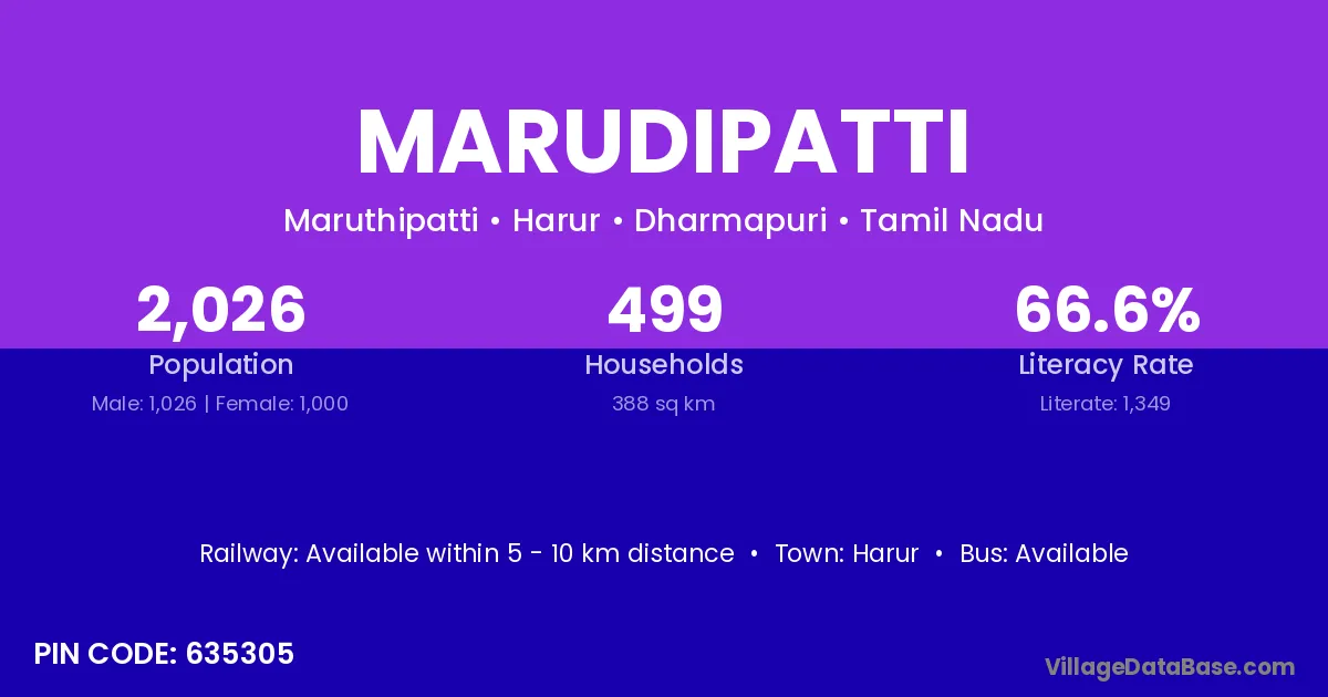 Marudipatti village has a total population of 2,026 people, of which 1,026 are males and 1,000 are females.