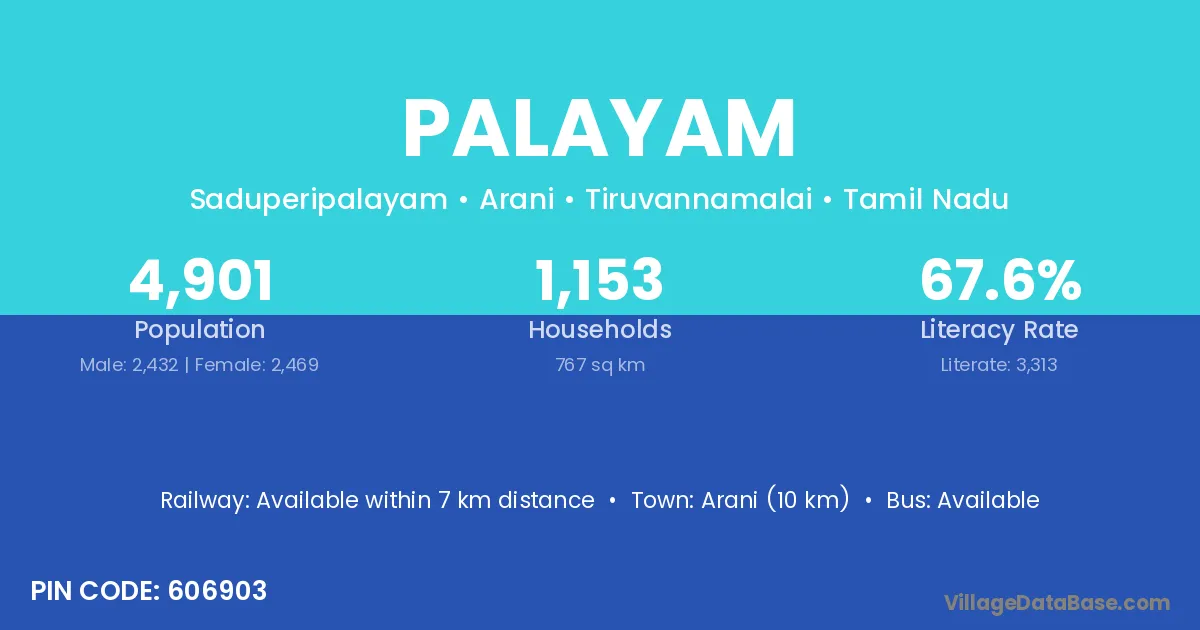 Palayam village has a total population of 489 people, of which 256 are males and 233 are females.