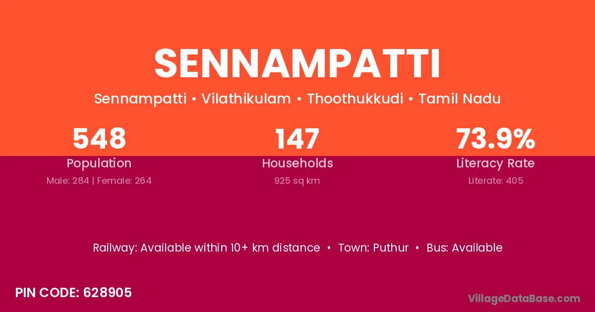The literacy rate of Sennampatti village is 75.77%. Male literacy stands at 81.01% and female literacy at 70.58%.