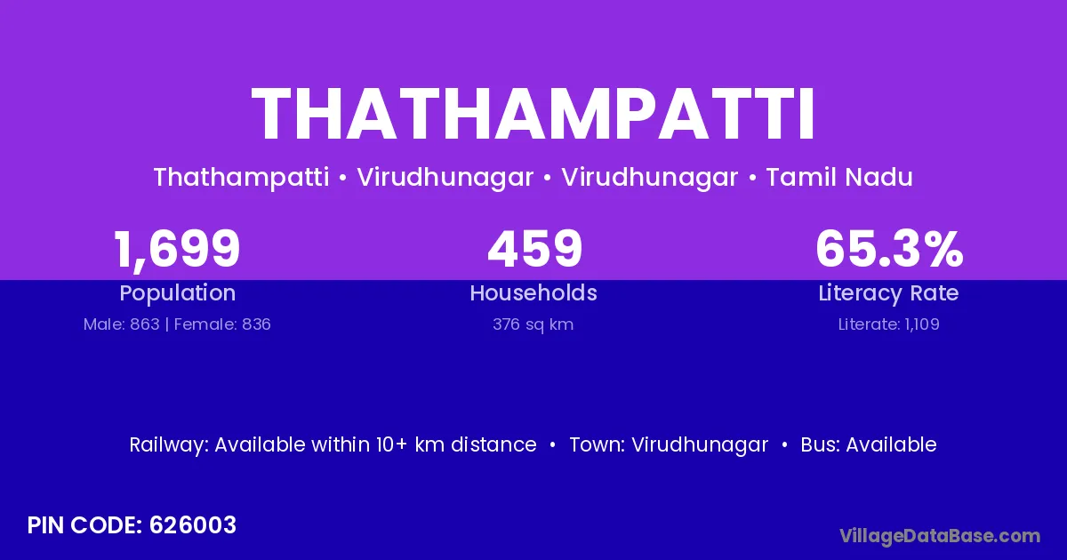 The literacy rate of Thathampatti village is 45.83%. Male literacy stands at 51.47% and female literacy at 39.85%.
