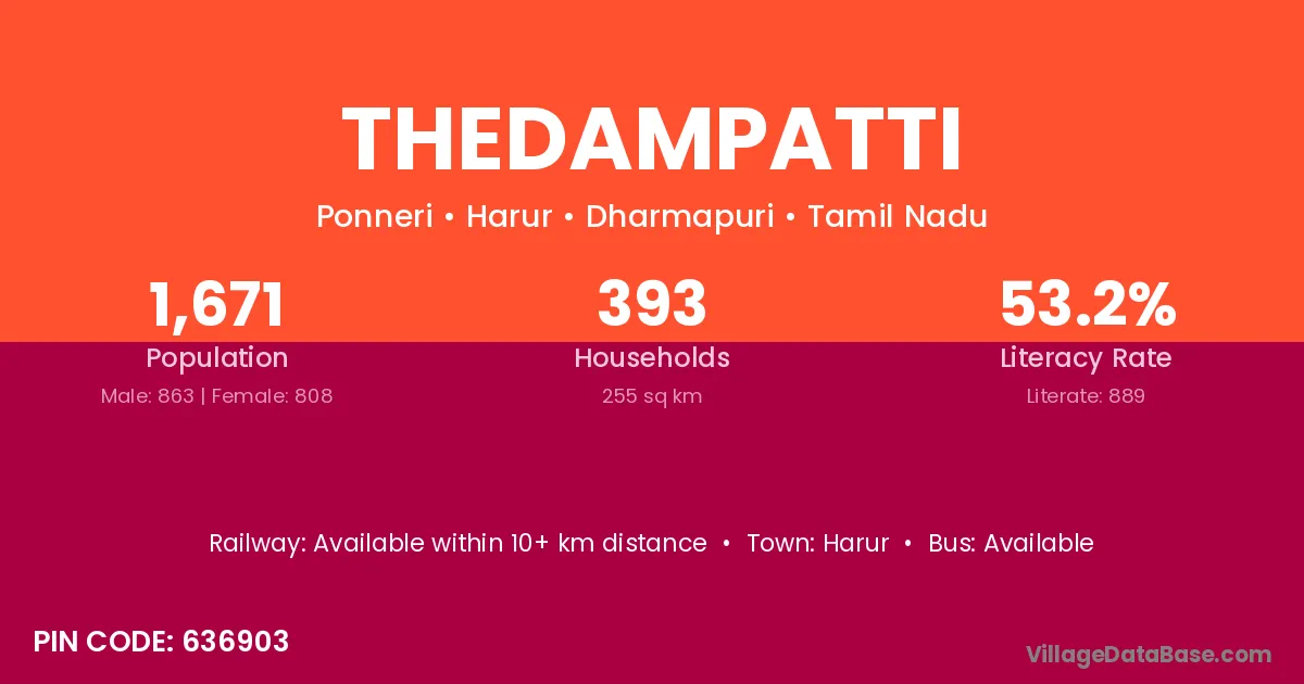 Thedampatti village has a total population of 1,671 people, of which 863 are males and 808 are females.
