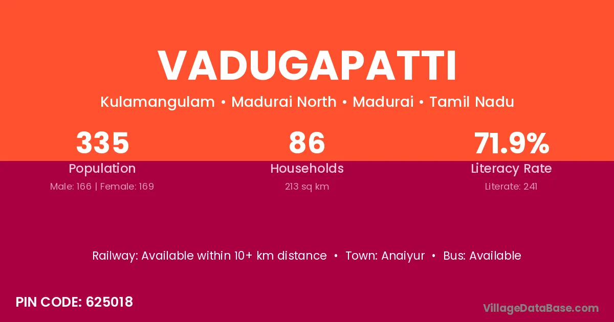 Vadugapatti village has a total population of 725 people, of which 378 are males and 347 are females.
