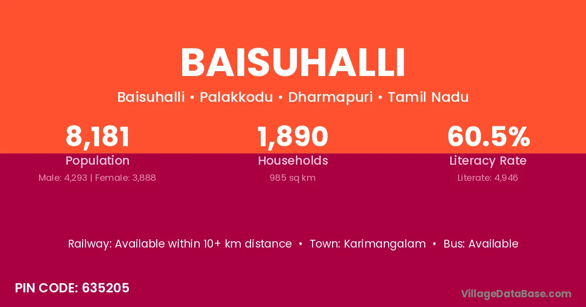 Karimangalam is the nearest town to Baisuhalli village for major economic activities